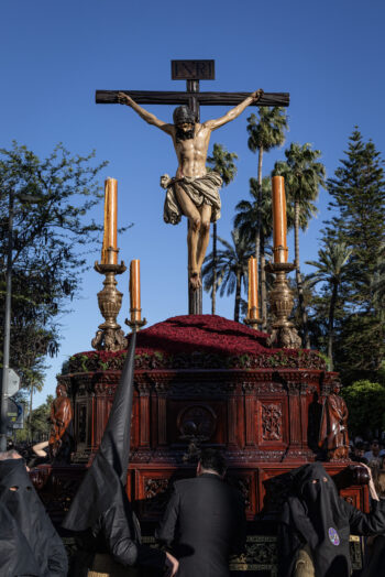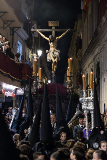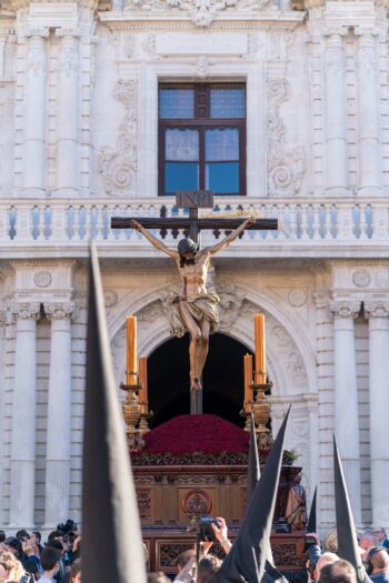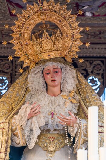 Pasadas las siete y media (19.35 horas), salía el paso de palio de María Santísima de la Angustia, con la candelería completamente encendida y un delicado exorno de clavellinas blancas. La dolorosa, obra de Juan de Astorga, lucía sobre su pecho la medalla de la Universidad de Sevilla, acompañada de un puñal de oro y la cruz pectoral donada por la cuadrilla de costaleros, de oro y rubíes.