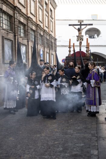 A las seis y media de la tarde, con puntualidad solemne, se abrían las puertas del vestíbulo universitario. Una abarrotada calle San Fernando aguardaba el discurrir de los nazarenos de ruán negro en un Martes Santo radiante, marcado por el sol intenso y temperaturas elevadas, tras dos años en los que la lluvia había impedido la salida de la cofradía.