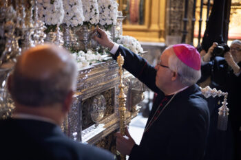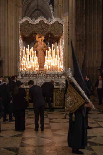Ya en la Catedral, el proyecto Vía Sacra aportó una nueva dimensión al tránsito de la cofradía por el templo metropolitano, realzando el recogimiento de nazarenos y la solemnidad de las Sagradas Imágenes. El arzobispo de Sevilla, monseñor José Ángel Saiz Meneses, recibió a los dos pasos en la Puerta de San Miguel y, en un gesto significativo, llegó a tocar el martillo del paso de palio a petición del capataz Antonio Santiago.